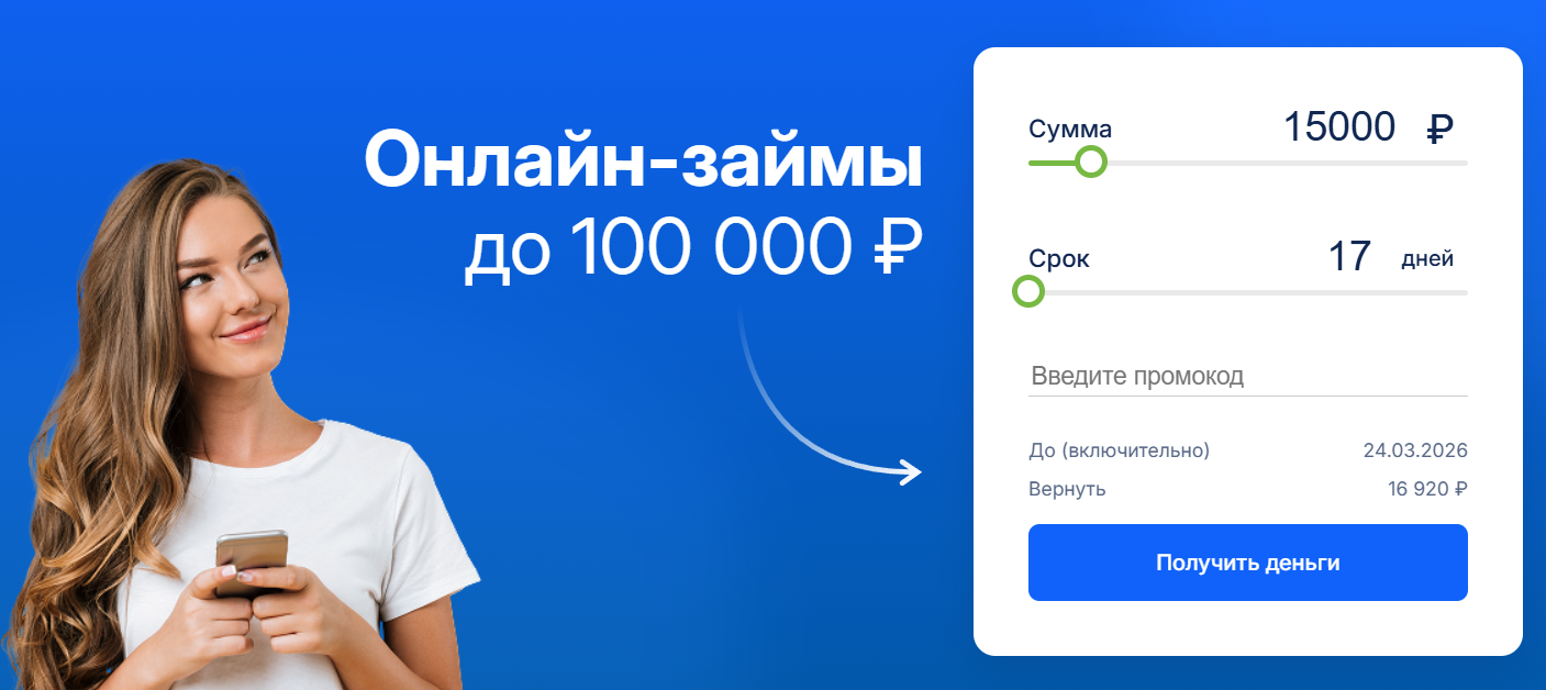 Деньги сразу — легальная российская МФО, выдающая онлайн и в офисах займы от 1 000 до 100 000 руб. на срок от 1 дня до 6 месяцев (ставка 0,77–0,8% в день). Оформление занимает 15-20 минут, нужен только паспорт. Подходит для получения денег с плохой кредитной историей, есть пролонгация.