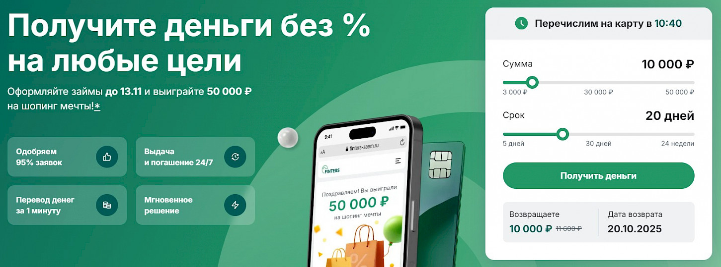 FINTERS - это доступный и технологичный сервис онлайн-займов, стартовал в конце августа 2023 года. В FINTERS доступны онлайн-займы на сумму до 30 тысяч рублей и срок до 30 дней — круглосуточно и без выходных по всей России.