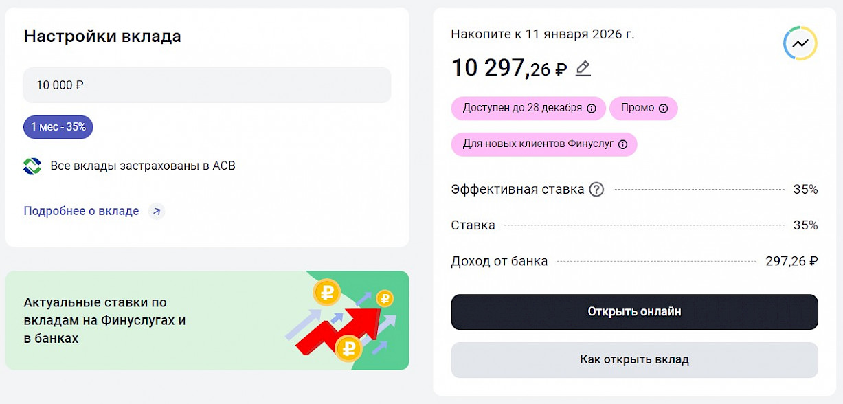 🎁 Бонус до +5% годовых к ставке по вкладу для клиентов, которые откроют свой первый вклад на Финуслугах и применят промокод VKLAD2025.