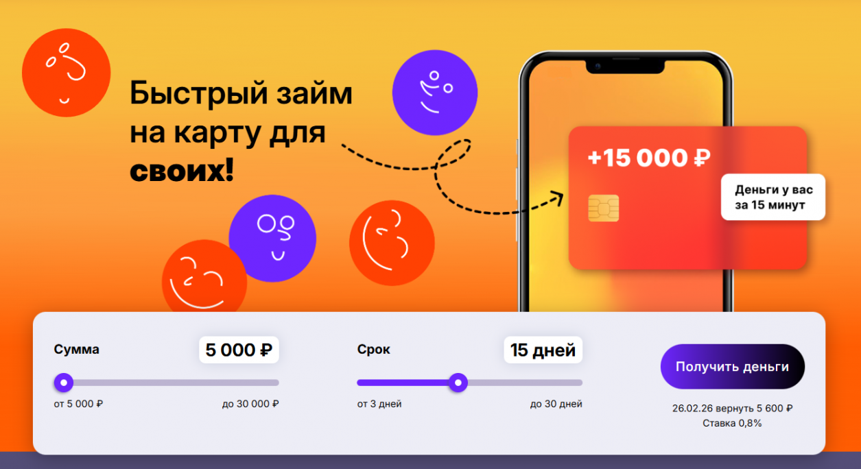 Выберите необходимую сумму от 3 000 до 30 000 рублей на срок до 1 месяца и подайте заявку на получение денег сразу на банковскую карту.